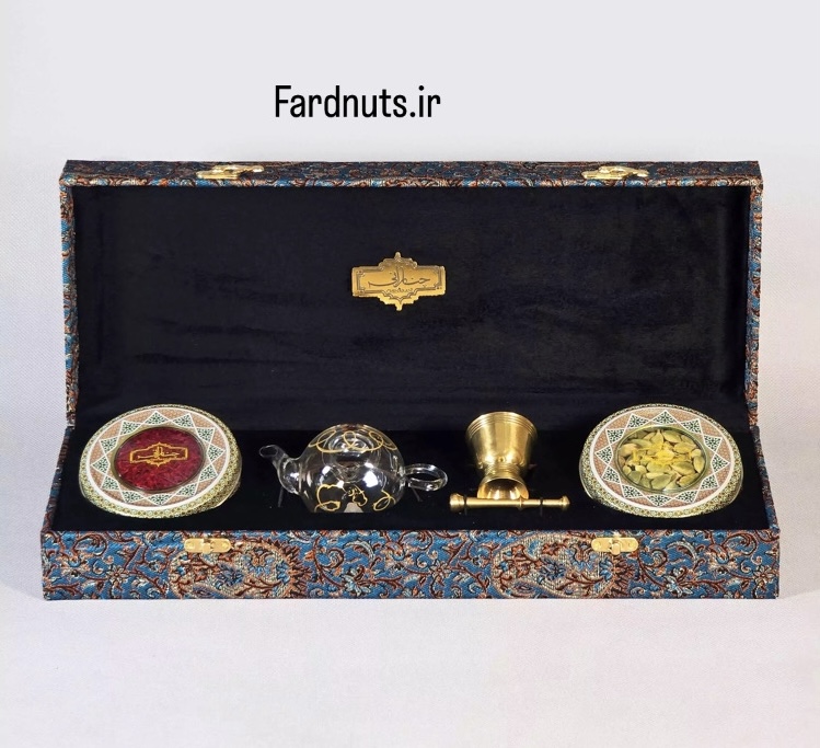 این جعبه کادویی حاوی 5 گرم زعفران و 10 گرم هل و همراه با هاون و قوری می‌باشد